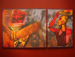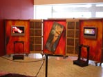 Por Humberto Yashima 23/09/2005 A exposição Quixote: Fronteira Digital, que faz parte da 3ª Mostra Cervantes - Revisões do Século XXI (já divulgada aqui), ficará aberta ao público até o dia 01 de outubro no Espaço Cultural do Instituto Cervantes (Avenida Paulista, 2439). De terça a sexta, das 12h às 21h, e nos sábados, das 11h às 17h, os visitantes do Instituto podem apreciar as obras criadas pelo artista plástico Ariel Artigas Severino, uruguaio que vive em São Paulo desde 1974. Estão em exposição as Bandeiras da Liberdade, pinturas digitais de Severino, e a instalação Quero Paz!, com monitores de vídeo exibindo imagens criadas pelo artista acompanhados de fones de ouvido onde músicas estão sendo tocadas - a interpretação dessas obras depende de cada observador. Veja abaixo algumas fotos que tiramos da exposição.
