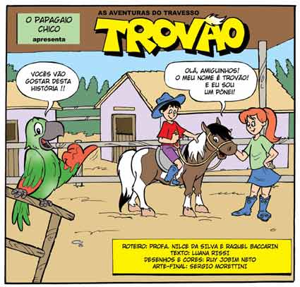 O Mundo dos Cavalos - Uma Possibilidade de Alfabetização, iniciativa do Projeto Acolhendo – divulgado aqui -, coordenado pela Profa. Dra. Nilce da Silva, da Faculdade de Educação da USP, tem como objetivo utilizar o convívio de crianças com cavalos para auxiliá-las em sua alfabetização. Participarão do projeto 36 crianças - selecionadas em 4 escolas da periferia – que sabem ler e escrever, mas não compreendem enunciados ou notícias. As crianças terão aulas de equitação e conhecerão os cavalos que terão suas vidas transformadas em Histórias em Quadrinhos, além de participarem de aulas específicas de Língua Portuguesa, onde contarão com exercícios e textos dirigidos. As HQs têm argumento de Luana Rissi e roteiros das professoras Nilce da Silva e Raquel Baccarin (da Veterinária-USP); os desenhos e cores ficam por conta de Ruy Jobim Neto e a arte-final é assinada por Sergio Morettini. Já foi finalizada a primeira história, de seis páginas, que conta a trajetória do pônei Trovão, um dos campeões de visitas da hípica Recanto dos Cavaleiros; em seguida serão contadas as histórias dos cavalos Raja, Estrela e Charlie. |