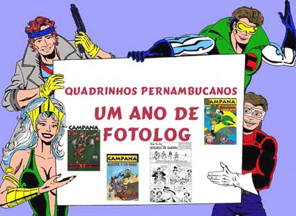 O fotolog Quadrinhos Pernambucanos, criado e mantido por Sandro Marcelo, quadrinhista e editor da publicação independente Campana, acaba de completar um ano de existência. O primeiro post de Quadrinhos Pernambucanos, a capa da Campana #2, foi ao ar no dia 22 de março do ano passado. Sandro Marcelo é criador, entre outros, dos personagens Blagster, Conversor, Notívago e Diamante, que estão (no sentido horário) na ilustração acima festejando a data. Para conhecer o Quadrinhos Pernambucanos clique aqui. |