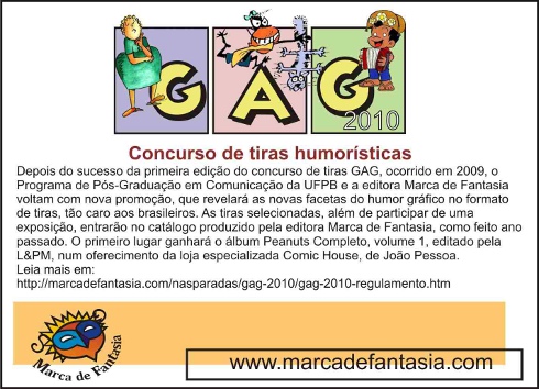 Por Matheus Moura 09/09/2010 O Núcleo de Artes Midiáticas do Programa de Pós-Graduação em Comunicação (PPGC) da Universidade Federal da Paraíba (UFPB) e a editora Marca de Fantasia promovem o concurso GAG de Tiras Humorísticas 2010. O concurso é aberto a todos os artistas gráficos, brasileiros ou não, amadores ou profissionais e visa estimular a criação e difusão de tiras humorísticas por meio de exposição e edição de um catálogo com os selecionados. As inscrições vão até o dia 30 de setembro de 2010 e os trabalhos, assim como a ficha de inscrição, devem ser enviadas para o e-mail henriquemais@gmail.com. Como premiação, o primeiro colocado ganhará um exemplar do álbum Peanuts Completo, vol 1, publicado da L&PM Editora. Mais informações e regulamento completo no site oficial da editora Marca de Fantasia aqui. |